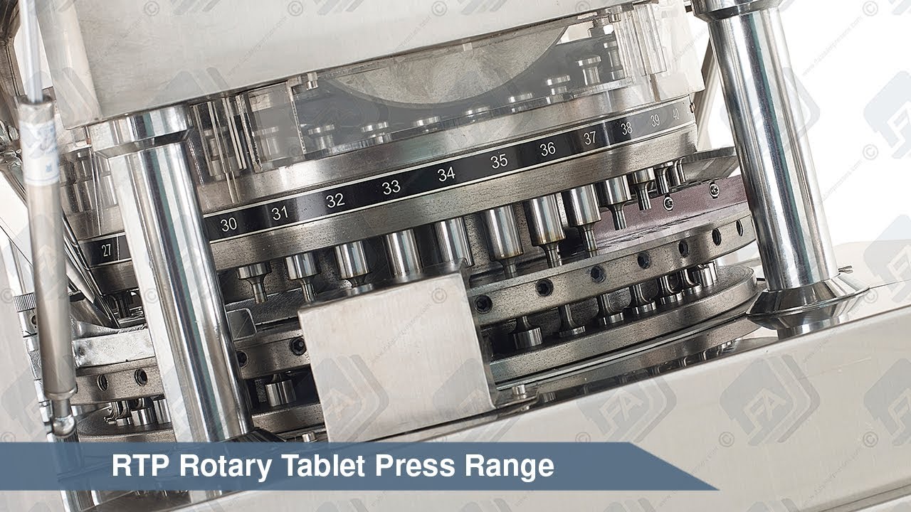 RTP 41 Rotary Tablet PressSophisticated and beautifully engineered, the RTP 41 is the flagship model in our tablet pressing range, offering the ultimate in safety, speed and feature set. ...Sophisticated and beautifully engineered, the RTP 41 is the flagship model in our tablet pressing range, offering the ultimate in safety, speed and feature set. With a 4 kw motor, 80 kN of available pressure, an optional two-colour capacity, the ability to produce tablets up to 12 mm in diameter in special shapes and with carved characters or motifs, semi-automatic lubrication, extremely fast production and all-electronic controls, this tablet press is in a class entirely of its own. Ideal for major manufacturers in the pharmaceutical, chemical and food technology industries, the RTP 41’s 41cutting heads can produce in the region of 180,000 tablets an hour, making it a true mass production unit.Starting fromUS$28,030.00 -